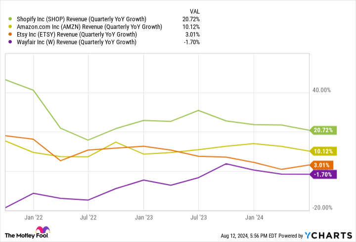John Mackey, former CEO of Whole Foods Market, an Amazon subsidiary, is a member of The Motley Fool’s board of directors. David Jagielski has no position in any of the stocks mentioned. The Motley Fool has positions in and recommends Amazon, Etsy, and Shopify. The Motley Fool recommends Wayfair. The Motley Fool has a disclosure policy.