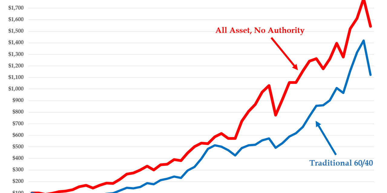 First, All Asset No Authority has produced higher total returns over the past half-century than 60/40. (It has trailed the much more volatile S&P 500, but by much less than you might think.)