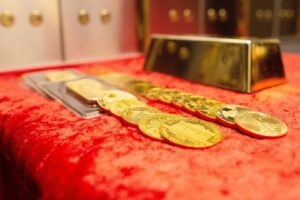 Gold loses ground Monday, with the yellow metal on track for a second straight monthly loss after a surge by the U.S. dollar in May.