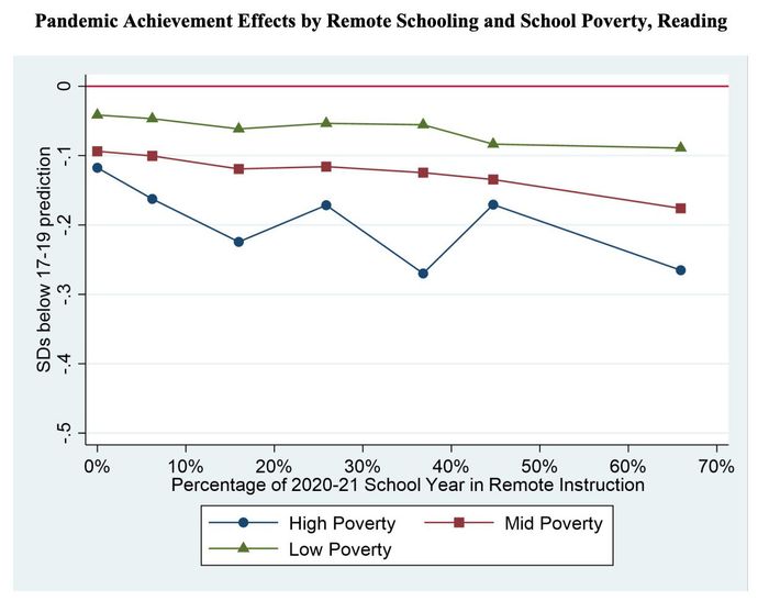 Gaps in math achievement did not widen in areas with in-person classes, though there was some fall off in reading. “We estimate that high-poverty districts that went remote in 2020-21 will need to spend nearly all of their federal aid on academic recovery to help students recover from pandemic-related achievement losses,” the paper added.