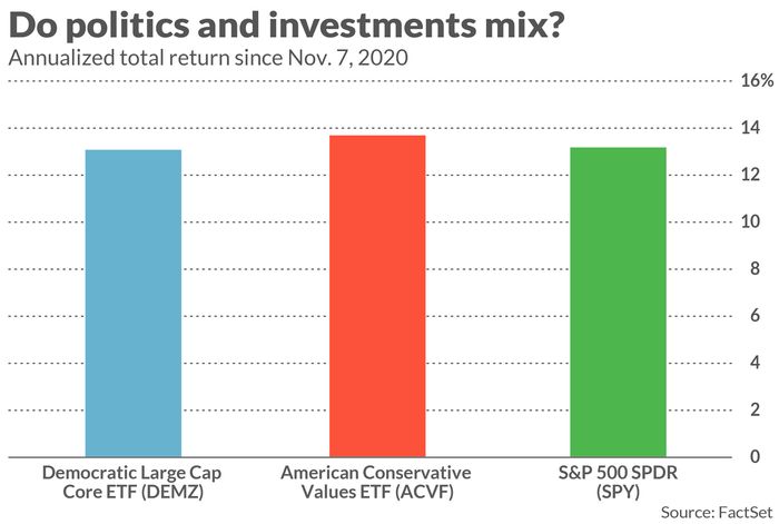 A good place to start in answering this question is with two exchange-traded funds that were created around the time of the 2020 U.S. presidential election: The American Conservative Values ETF ACVF, +0.68% and the Democratic Large Cap Core ETF DEMZ, -1.81%. Since Nov. 7, 2020, the first date for which FactSet has performance data for both ETFs, ACVF has produced a 14.4% annualized return, while DEMZ has produced a 14.2% annualized return. (See the chart below; data through April 29.)