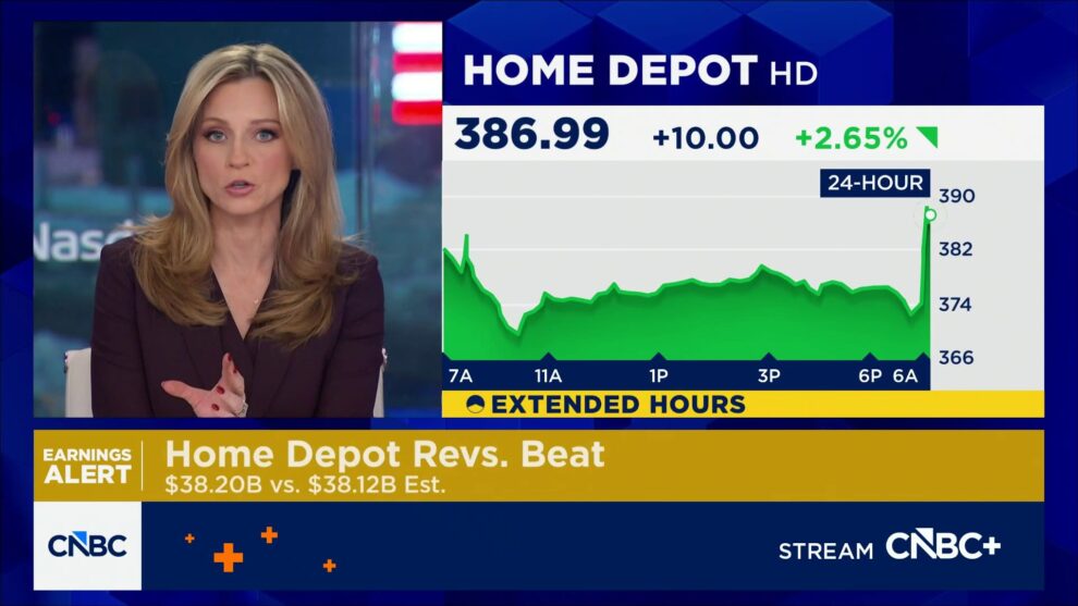 Shares of Home Depot rose about 2% on Tuesday, as the company beat earnings expectations after missing estimates three quarters in a row. Its stock closed at $384.48, bringing its market cap to $382.75 billion.