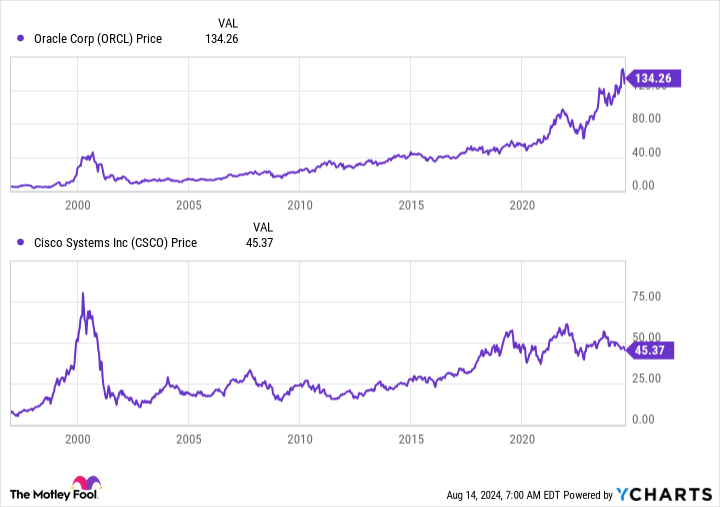 Perhaps the best comparison to today’s AI gold rush is the internet boom in the late 1990s and early 2000s. Companies like Cisco and Oracle were spearheading the stock market with the networking equipment needed to proliferate on the internet. However, that bubble burst, and it took Oracle nearly two decades to set a new high, while Cisco is still below its all-time high.