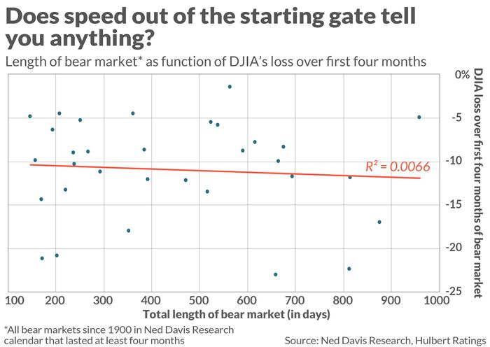 These 32 bear markets are plotted in the chart below. Notice the lack of any correlation between the magnitude of the bear market’s first-four-month loss and the eventual length of the bear market. The chart also shows the r-squared for the trendline that best fits the data points, and it’s essentially zero — indicating that there is no statistically significant relationship between the two data series.