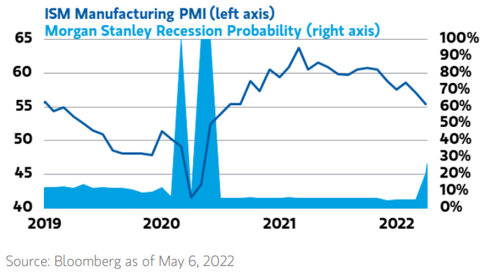 Morgan Stanley sees a 27% chance of recession in the next 12 months, with the probability jumping from just 5% in March, according to the note. Shalett said the Institute for Supply Management’s manufacturing PMI index, a gauge of U.S. factories, also is “signaling concern,” as it shows growth is decelerating.