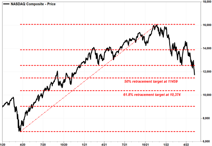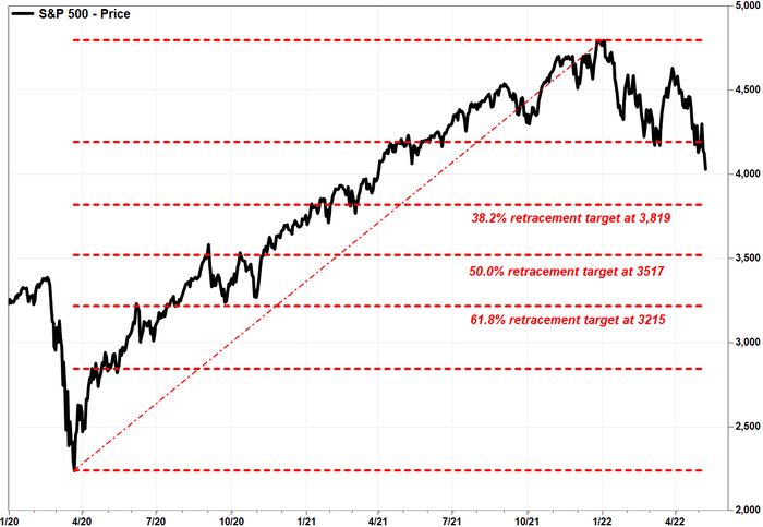 For the Dow, based on the rally off the pandemic closing low of 18,591.93 on March 23, 2020 and the Jan. 4, 2022 record close of 36,799.65, it has broken below the first Fibonacci retracement target of 23.6% at about 32,503. That makes the next retracement target, of 38.2%, at around 29,844, which would imply another 2,596-point drop from current levels. Read more about Fibonacci retracement targets.