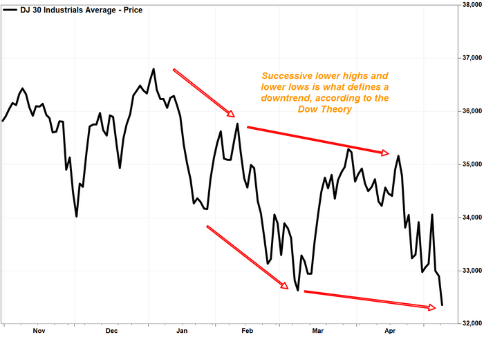 Based on the Dow Theory of market analysis, which has remained relevant among Wall Street chart watchers for over a century, a pattern of lower highs and lower lows is what defines a downtrend. Read more about the Dow Theory.