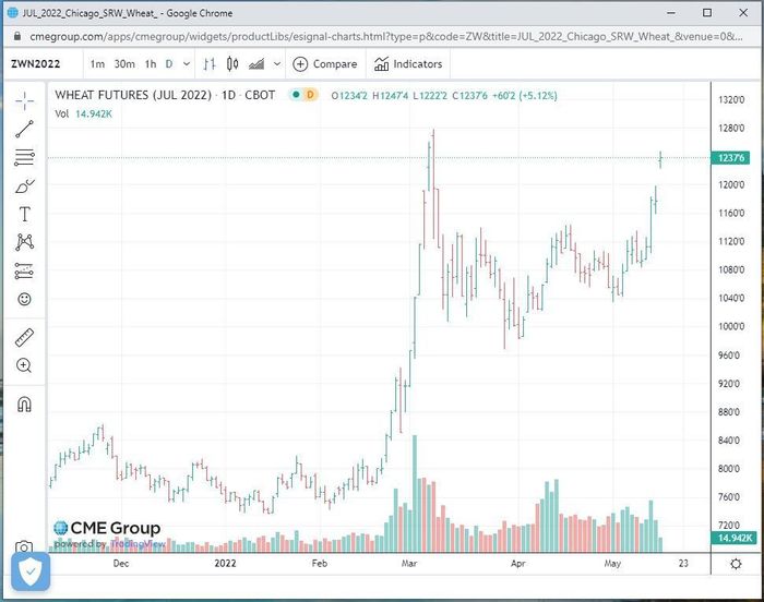 Soft red winter wheat for July delivery W00, +5.50% rose 62 cents, the normal daily price limit, to lock at $12.39 a bushel, a gain of 5.27%. The contract hit a high as $12.47 a bushel, and its highest level since mid-March.
