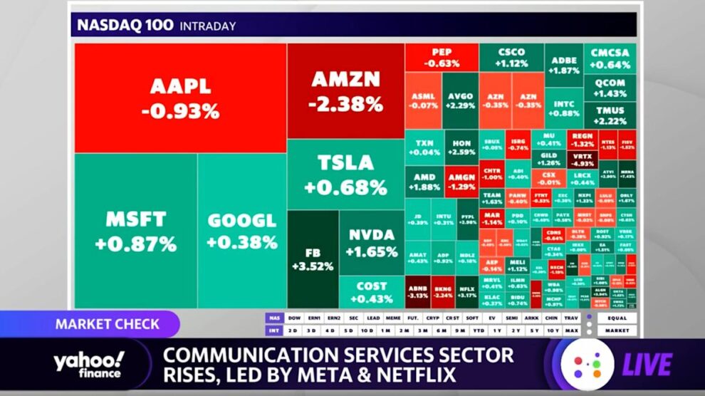 INES FERRE: And Brad, you mentioned volatility. I do want to mention the CBOE Volatility Index, the VIX. That is one of our trending tickers today. And just take a look at our YFi Interactive board. You can see it’s just below the 34 level. Also taking a look at the 10-year Treasury note, it’s up nine basis points at 2.98%. Looking at the sector action when we’re talking about equities, we are seeing today that communication services, that is in the green. This is partly because of Meta and because of Netflix.