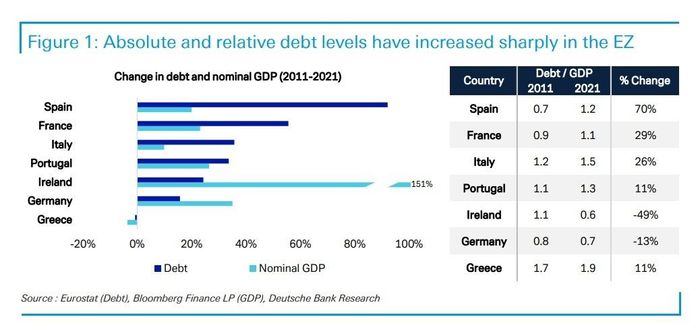 A decade after the eurozone financial crisis, are we on a precipice of another one? Deutsche Bank strategist Maximilian Uleer notes that both absolute and relative amounts of government debt haven’t improved much. This could lead to trouble as interest rates rise.