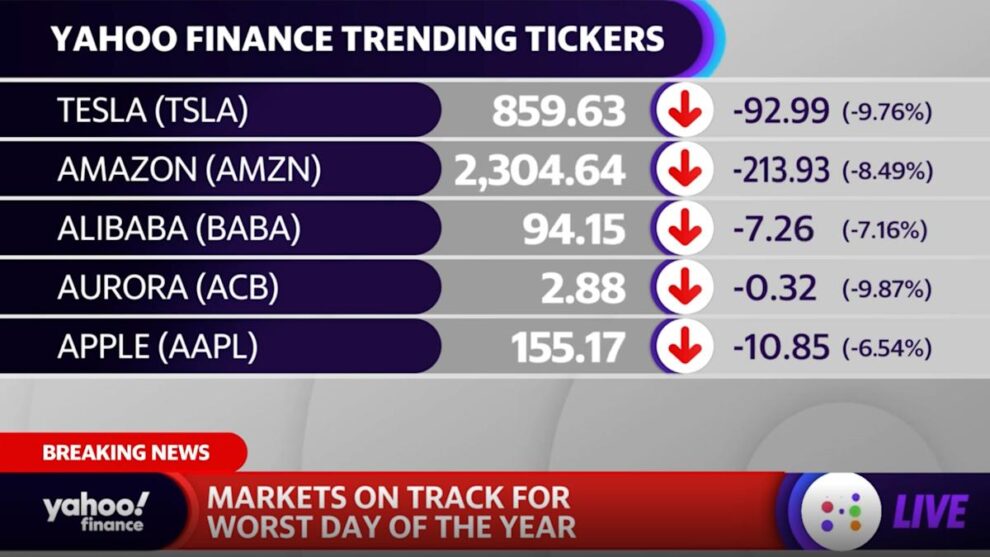 Taking a look at some of the trending tickers on our site. The biggest decliners that we are seeing. Tesla off just nearly 10%. Amazon, Alibaba, Aurora, and Apple rounding out the top five trending tickers, biggest decliners, on our site.