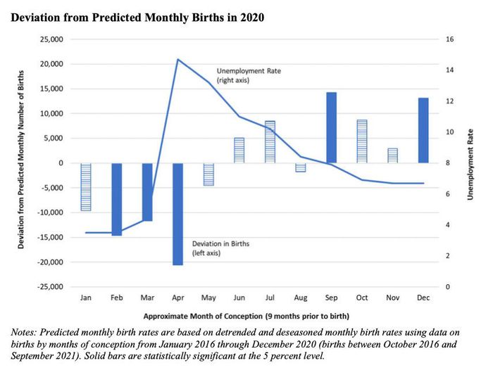Job cuts and business shutdowns resulted in 62,000 “missing births” in the U.S. from January 2020 to May 2020, the paper found. The lowest dip in approximate conception numbers happened in April, when the country saw the highest COVID-era unemployment rate at 14.7%.