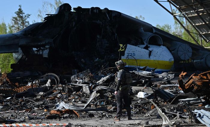 A serviceman stands guard at a destroyed Ukrainian cargo aircraft in the Kyiv region, on Thursday. Russia’s war in Ukraine is adding to inflationary pressures around the world.