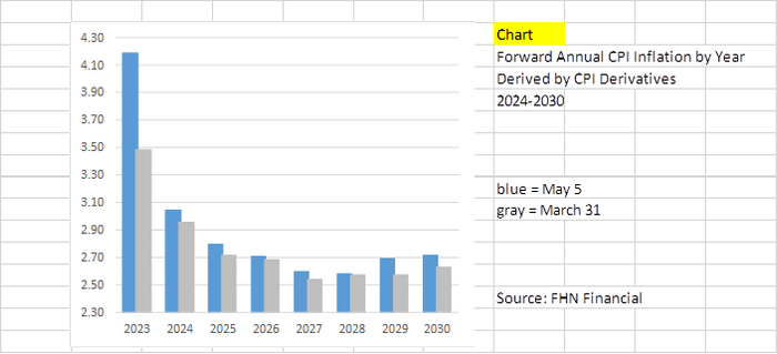 While the range of professional estimates on the consumer-price index, excluding food and energy, is 2% to 3.5% for next year, derivatives traders see core CPI coming in closer to 4.1% in 2023. The chart below shows where derivatives traders now see the gauge going, as reflected in the blue line, versus where they expected it to be in March.