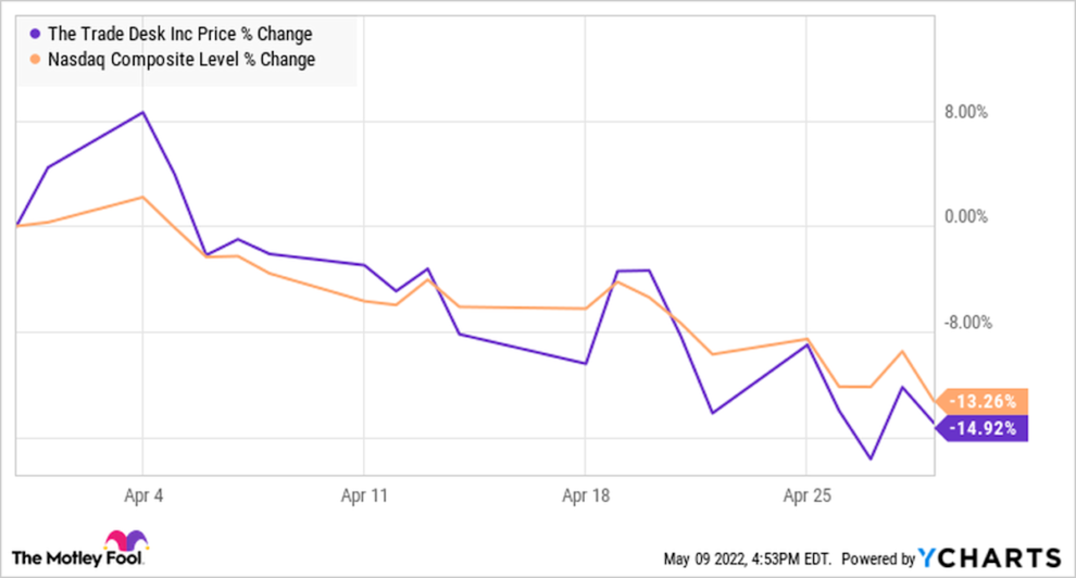 Shares of The Trade Desk (NASDAQ: TTD) were sliding with the broad market last month, even as there was little news out on the ad tech stock. Investors ditched high-growth, high-priced names throughout April, and Trade Desk was swept up in the sell-off. According to data from S&P Global Market Intelligence, the stock closed the month down 15%.