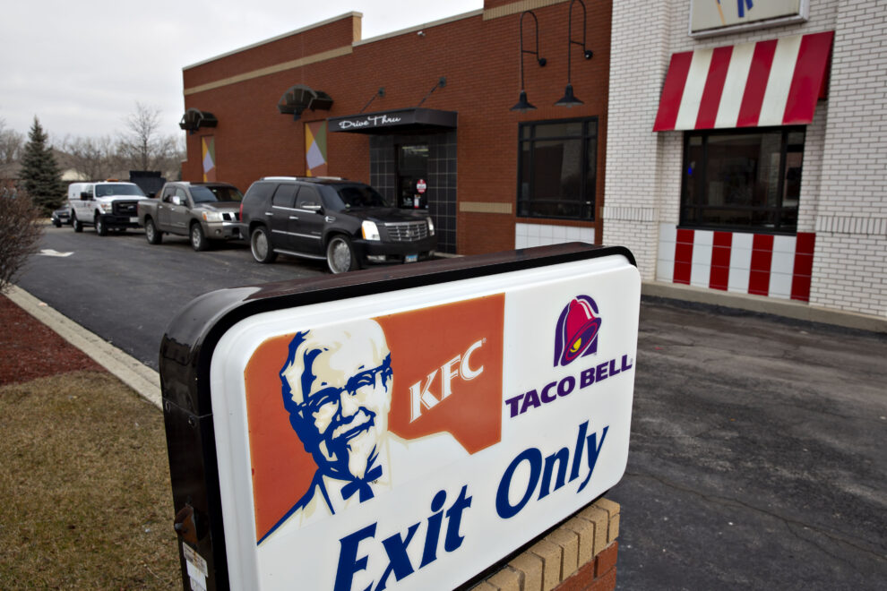 Vehicles wait in line at the drive through lane of a Yum! Brands Inc. Kentucky Fried Chicken (KFC) and Taco Bell restaurant in Lockport, Illinois, U.S.